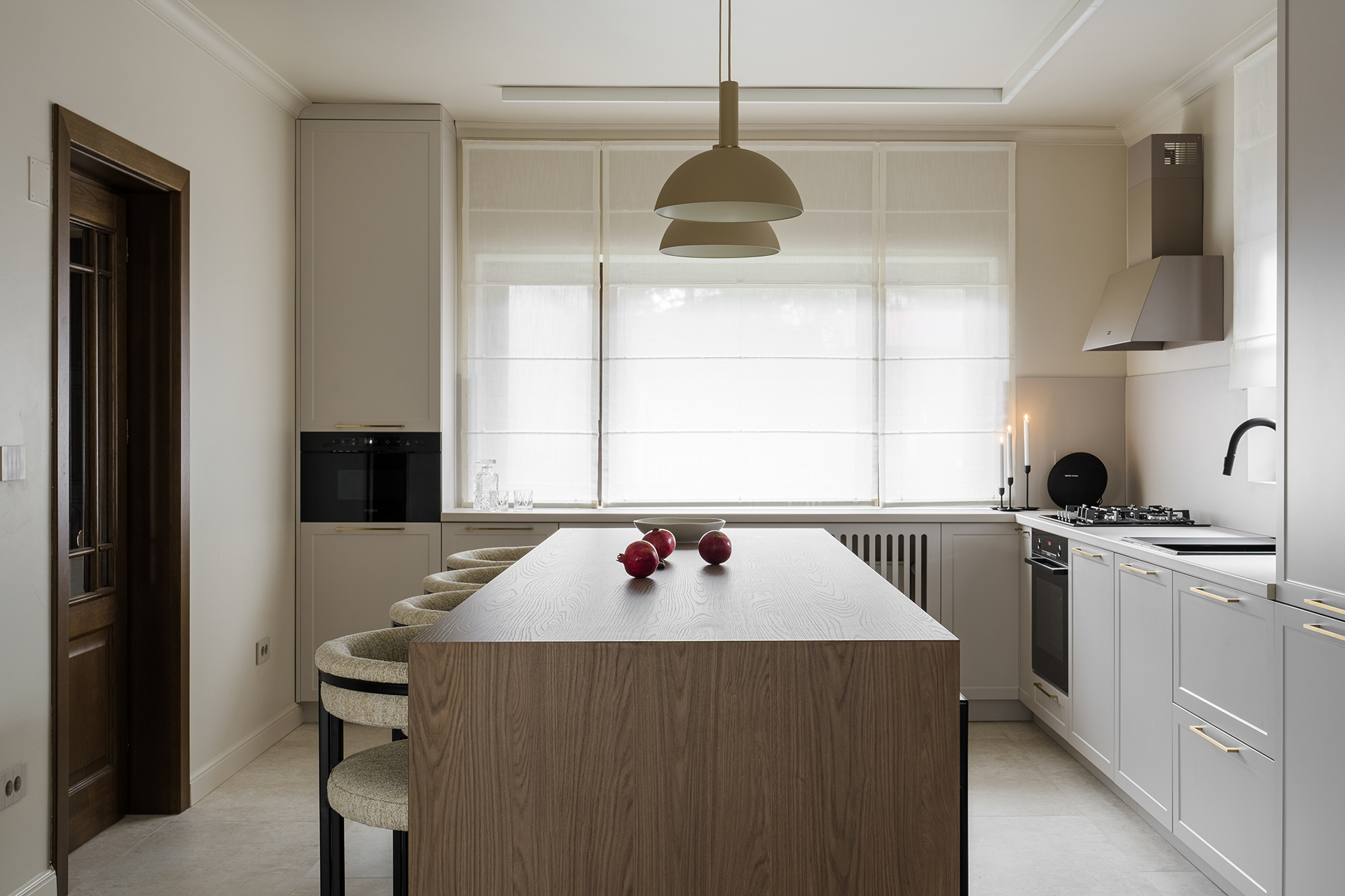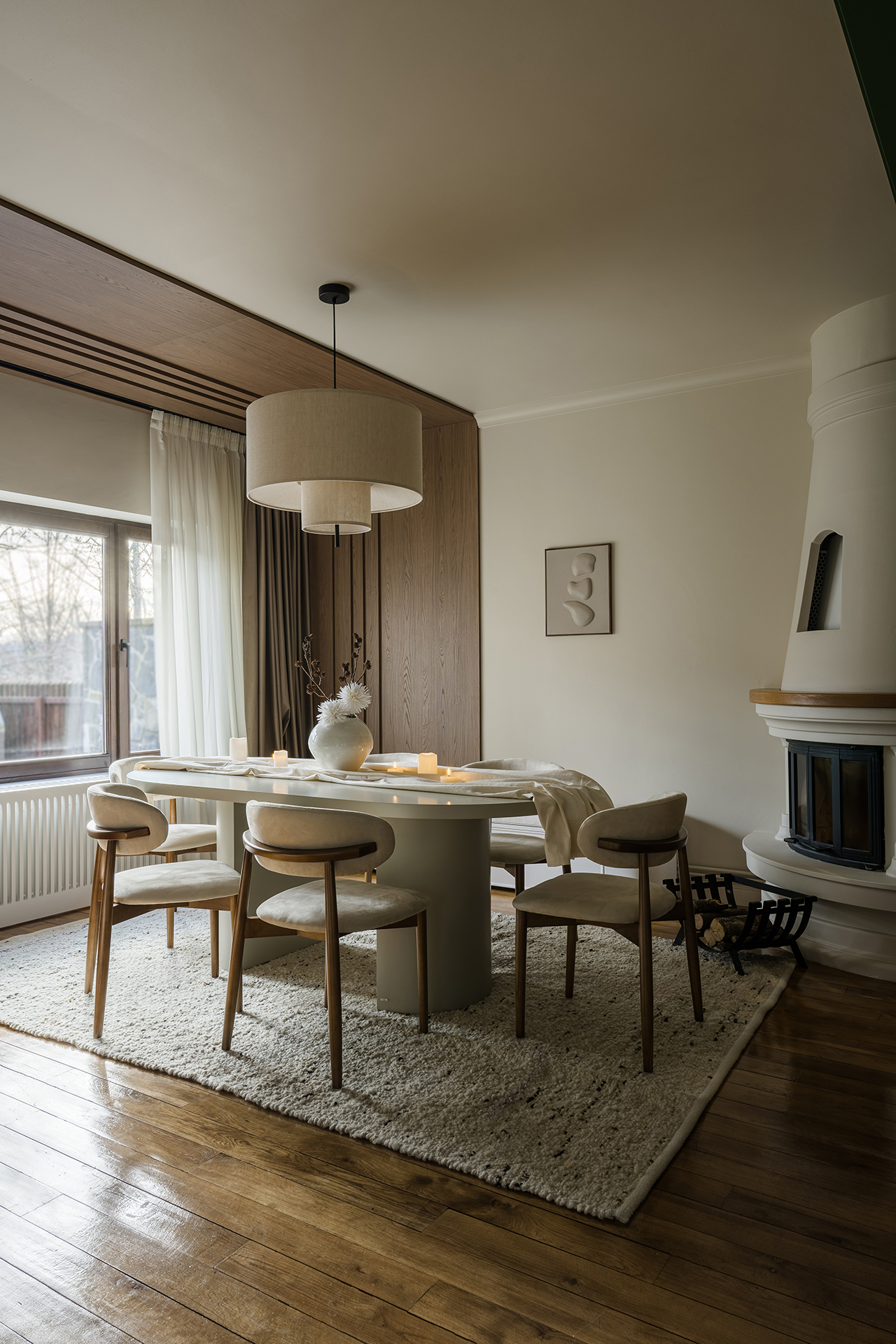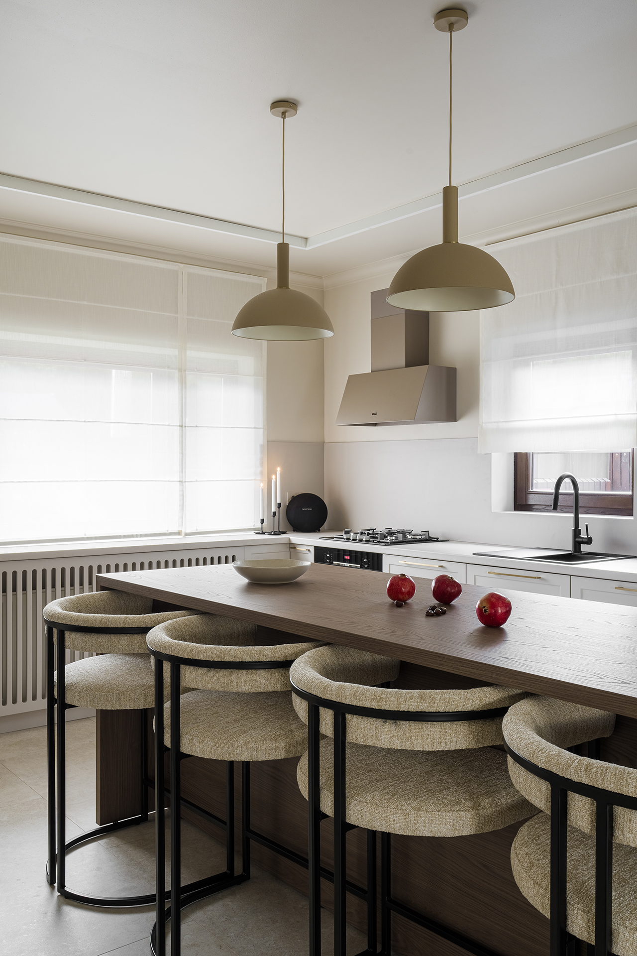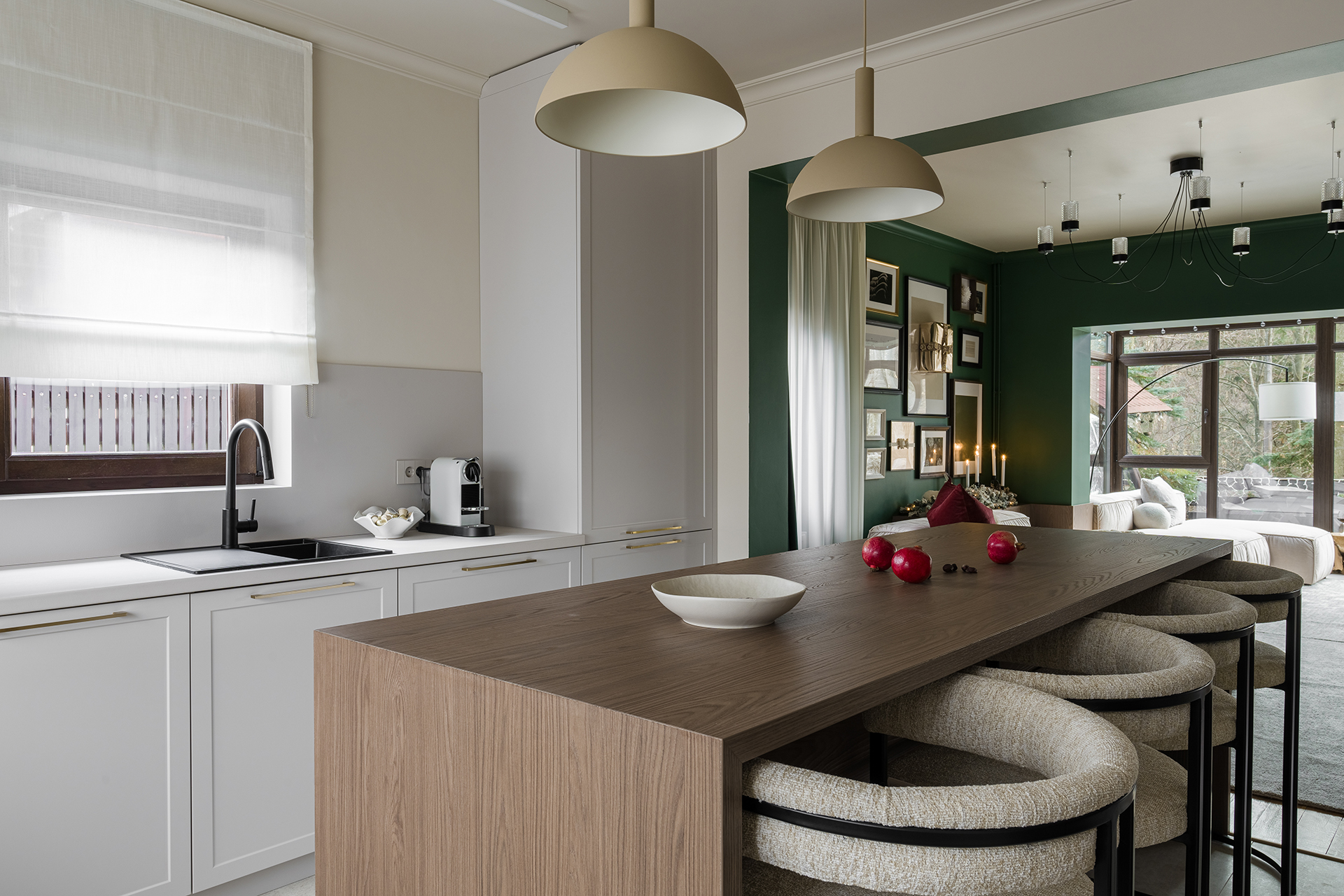 Zona de dining a fost gândită ca un loc de adunare în jurul mesei mari, completată spații dedicate copiilor. În completare, bucătăria a fost menținută într-un registru neutru, cu fronturi deschise la culoare care nu distrag atenția, dar cu o insulă centrală generoasă – locul unde familia se strânge pentru activități comune.