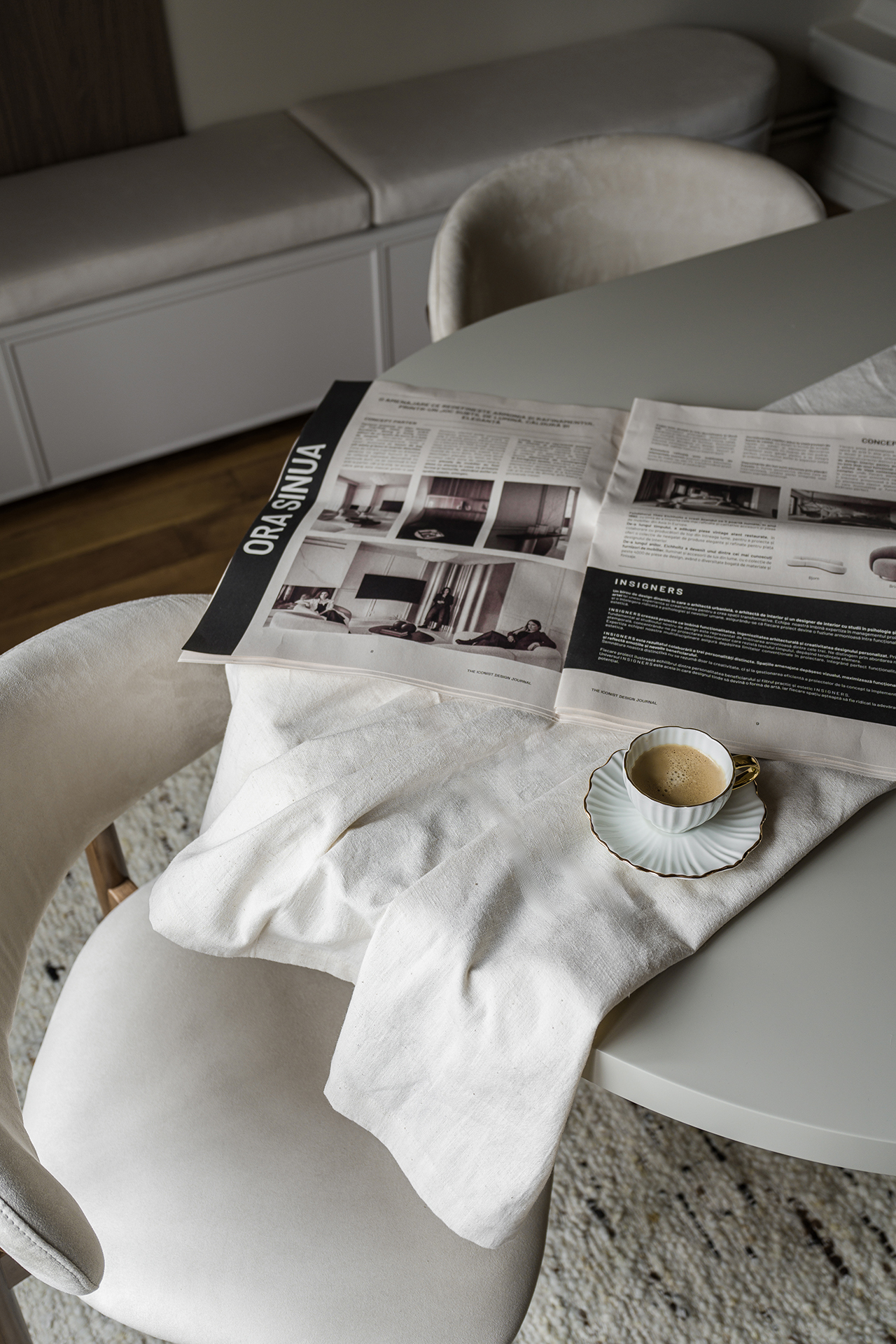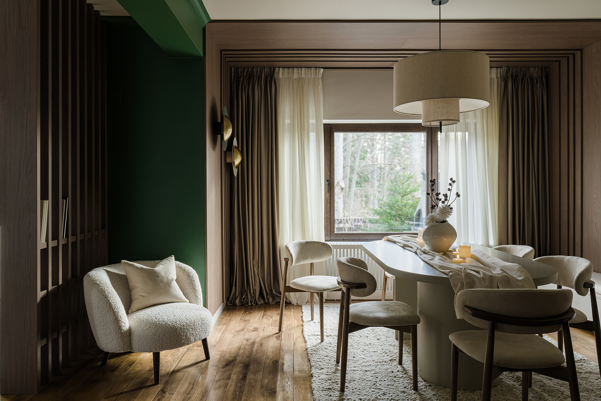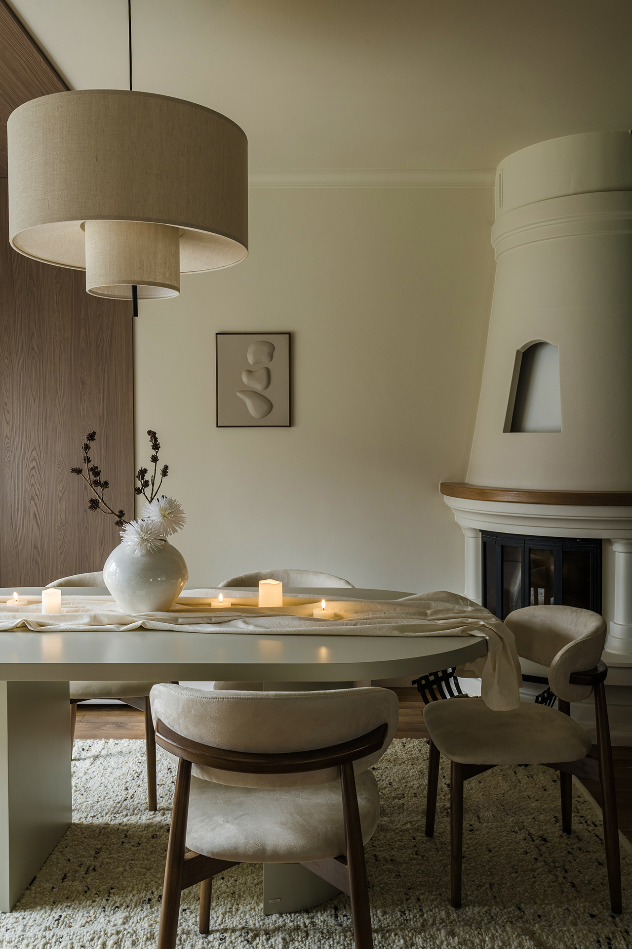 Zona de dining a fost gândită ca un loc de adunare în jurul mesei mari, completată spații dedicate copiilor. În completare, bucătăria a fost menținută într-un registru neutru, cu fronturi deschise la culoare care nu distrag atenția, dar cu o insulă centrală generoasă – locul unde familia se strânge pentru activități comune.
