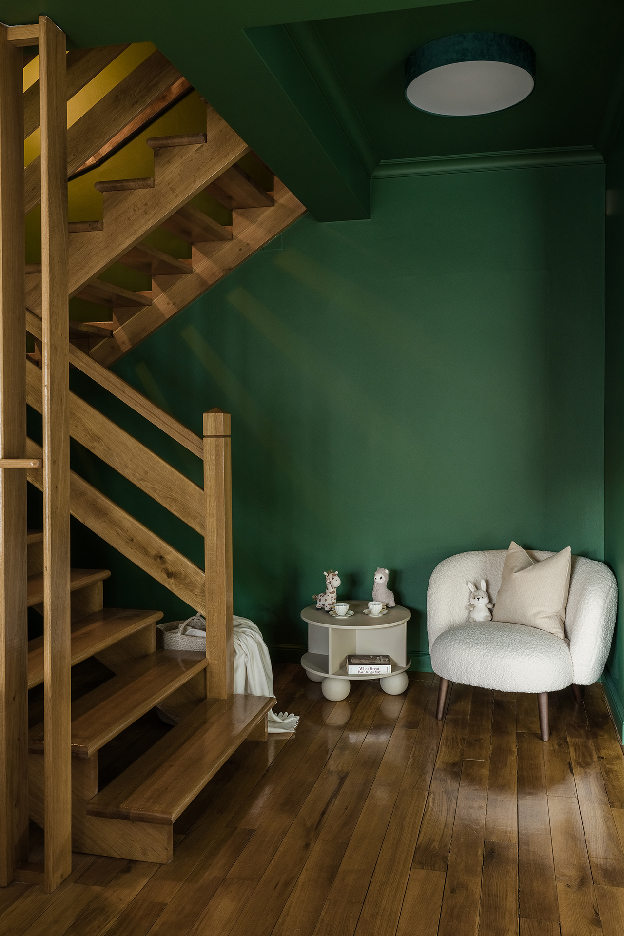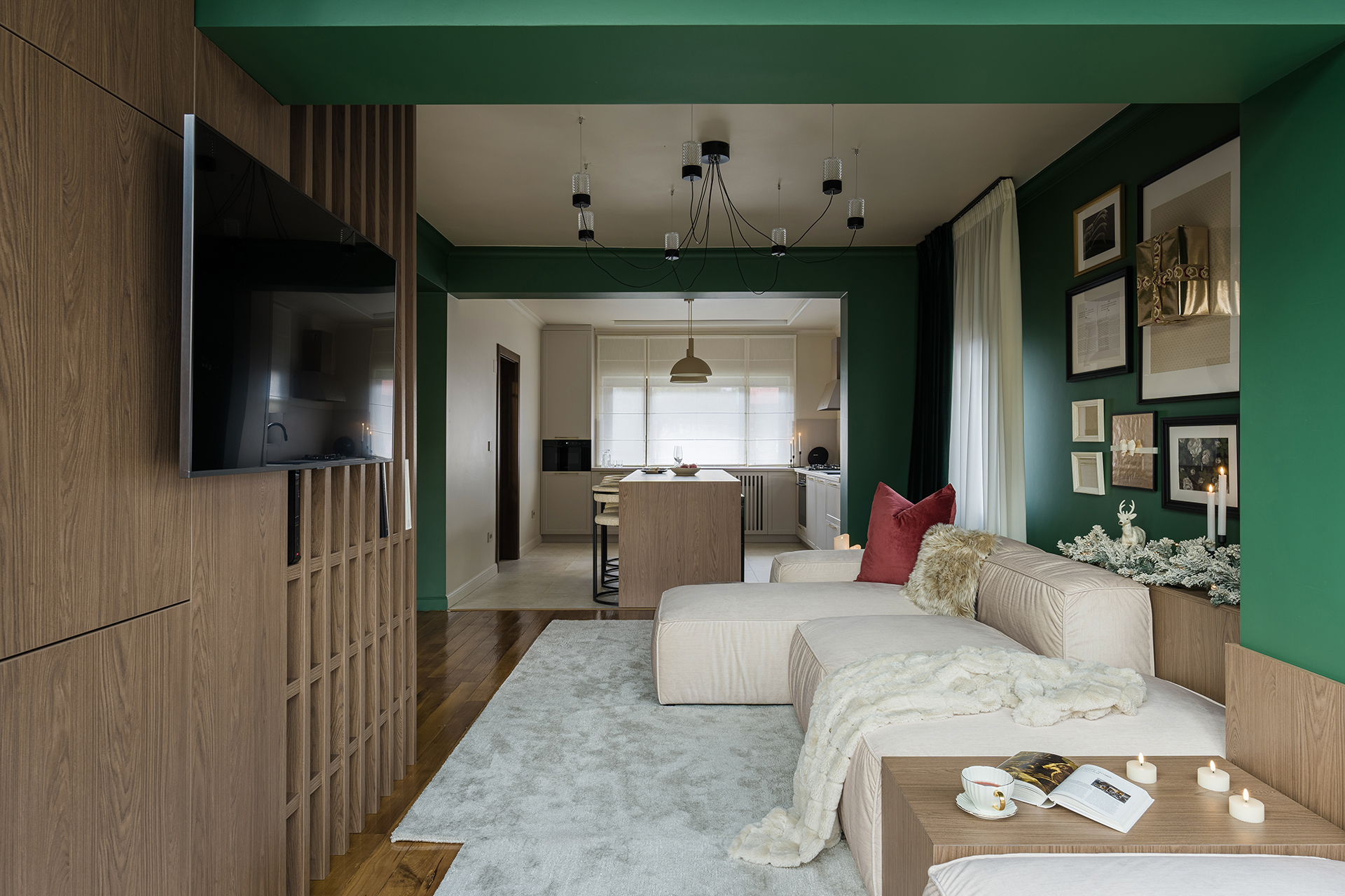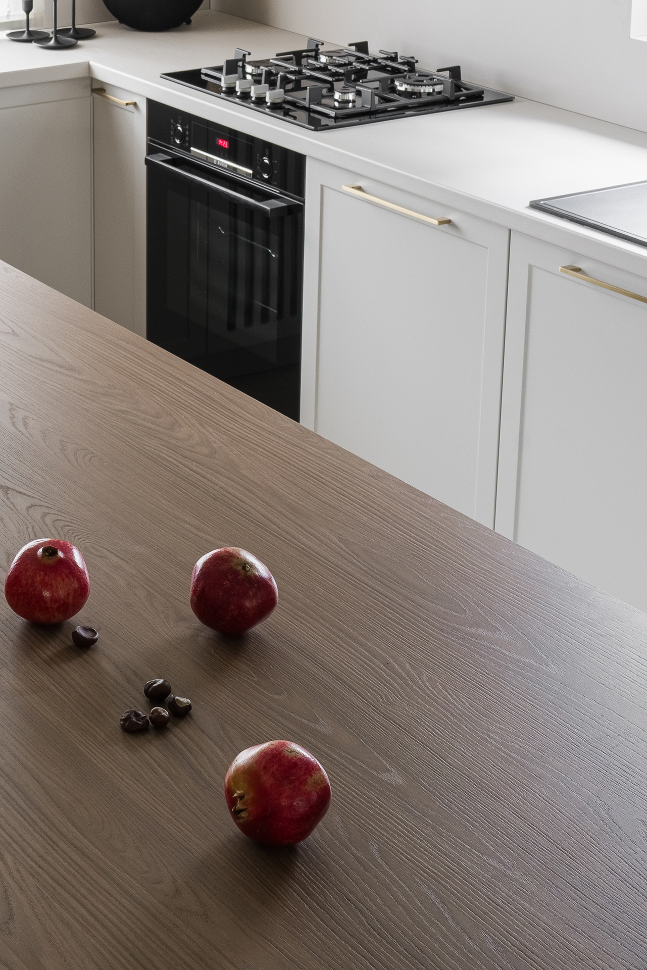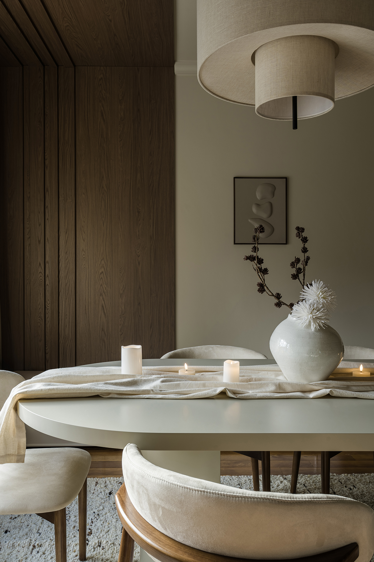 Zona de dining a fost gândită ca un loc de adunare în jurul mesei mari, completată spații dedicate copiilor. În completare, bucătăria a fost menținută într-un registru neutru, cu fronturi deschise la culoare care nu distrag atenția, dar cu o insulă centrală generoasă – locul unde familia se strânge pentru activități comune.