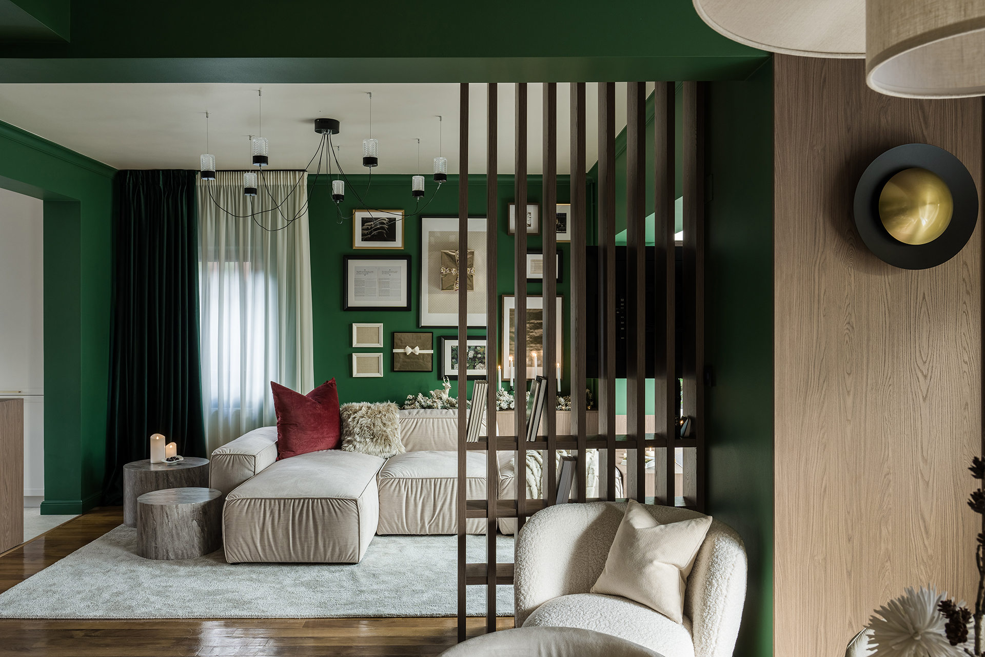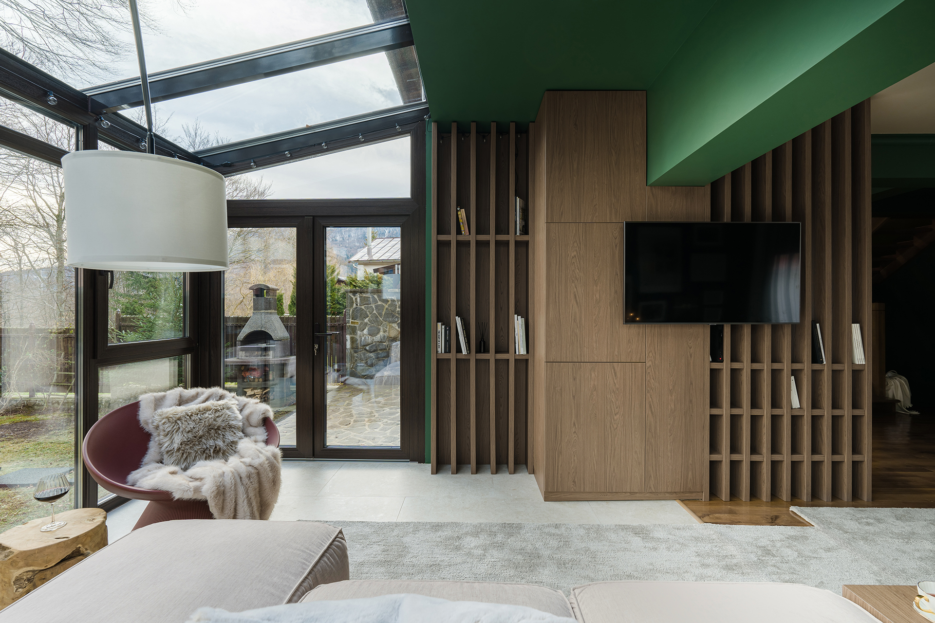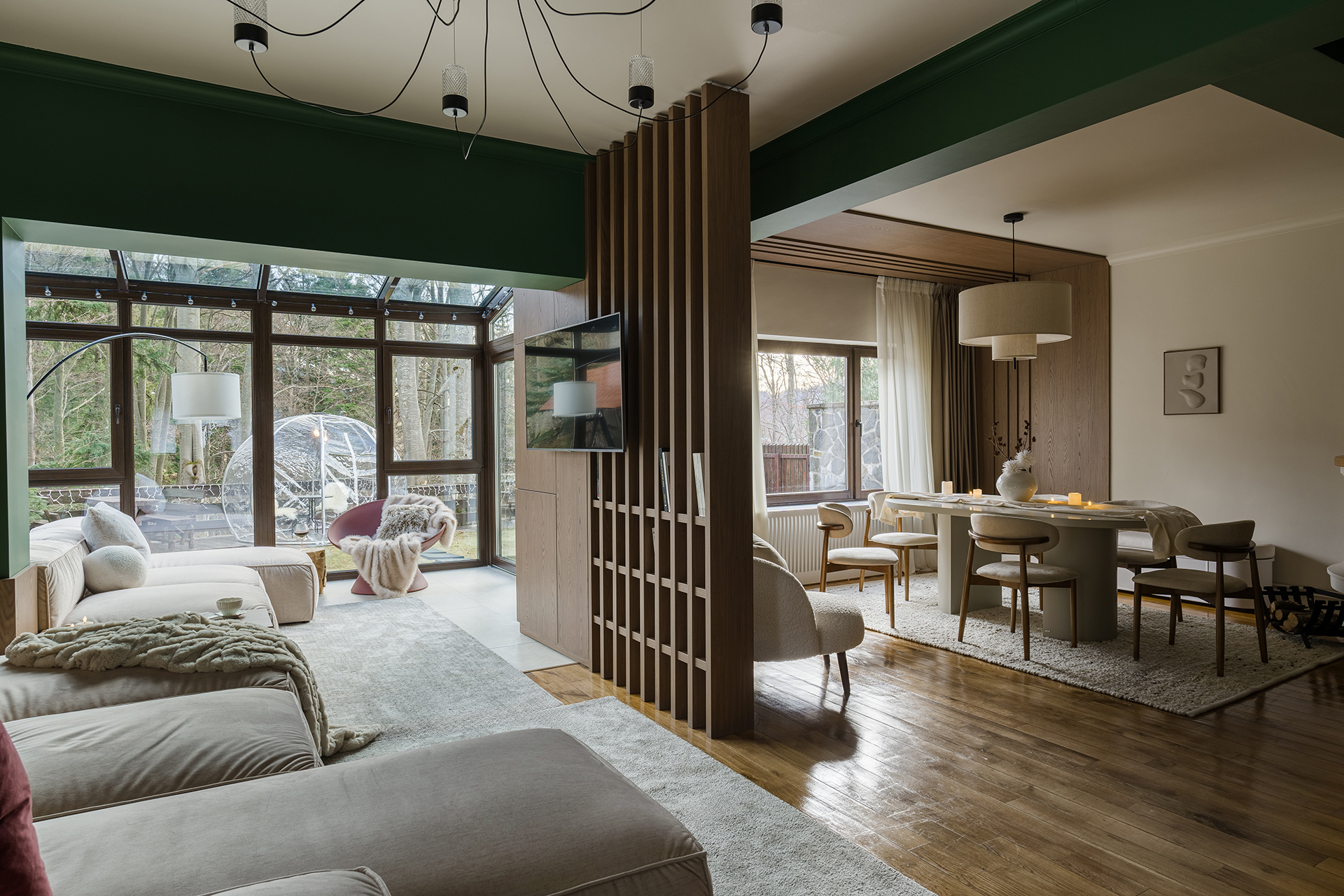 Un switch important în planimetrie a schimbat dinamica întregului parter: zona de dining a fost mutată, iar livingul a devenit mai generos. Acum, spațiul poate găzdui cu ușurință familia extinsă la sărbători. Canapeaua modulară, continuă până în terasa acoperită – o extensie vitrată a livingului, de unde priveliștea spre munți devine parte din experiența de zi cu zi.