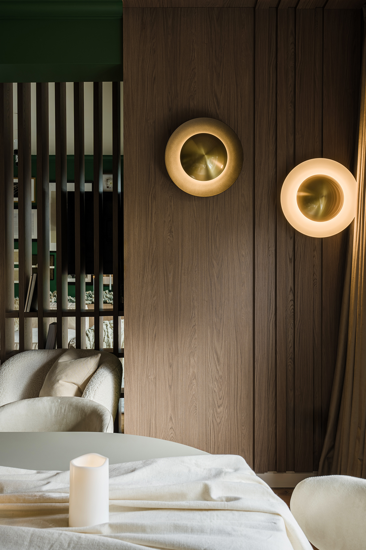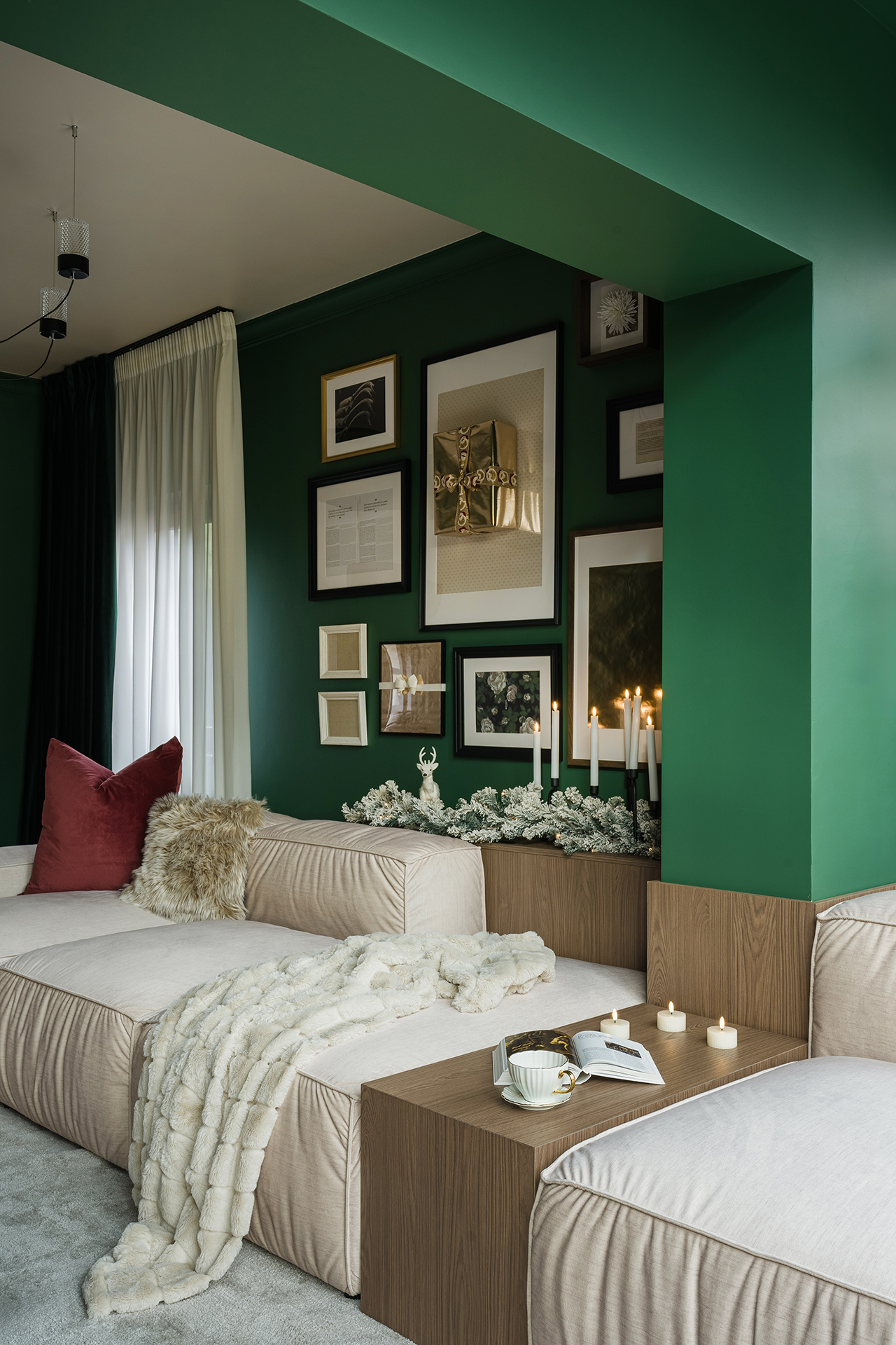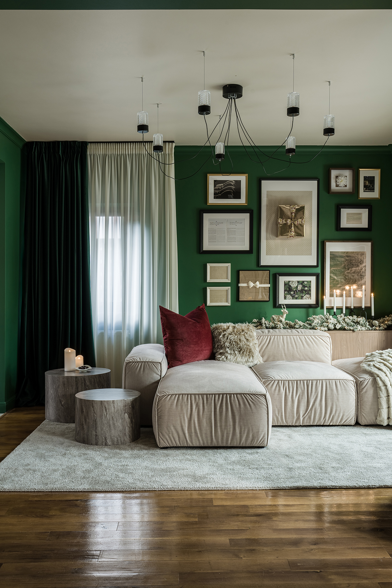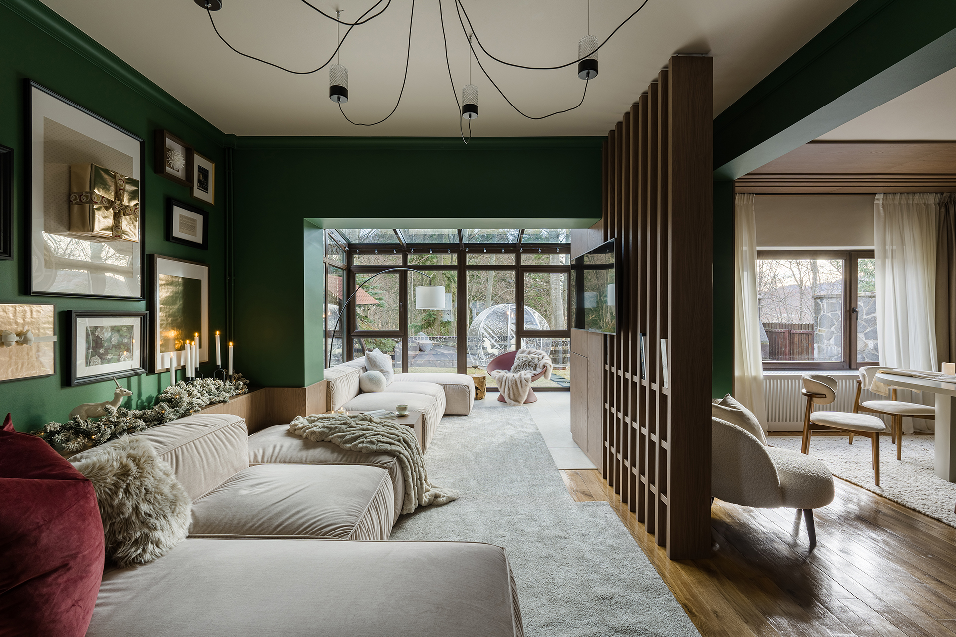 Un switch important în planimetrie a schimbat dinamica întregului parter: zona de dining a fost mutată, iar livingul a devenit mai generos. Acum, spațiul poate găzdui cu ușurință familia extinsă la sărbători. Canapeaua modulară, continuă până în terasa acoperită – o extensie vitrată a livingului, de unde priveliștea spre munți devine parte din experiența de zi cu zi.