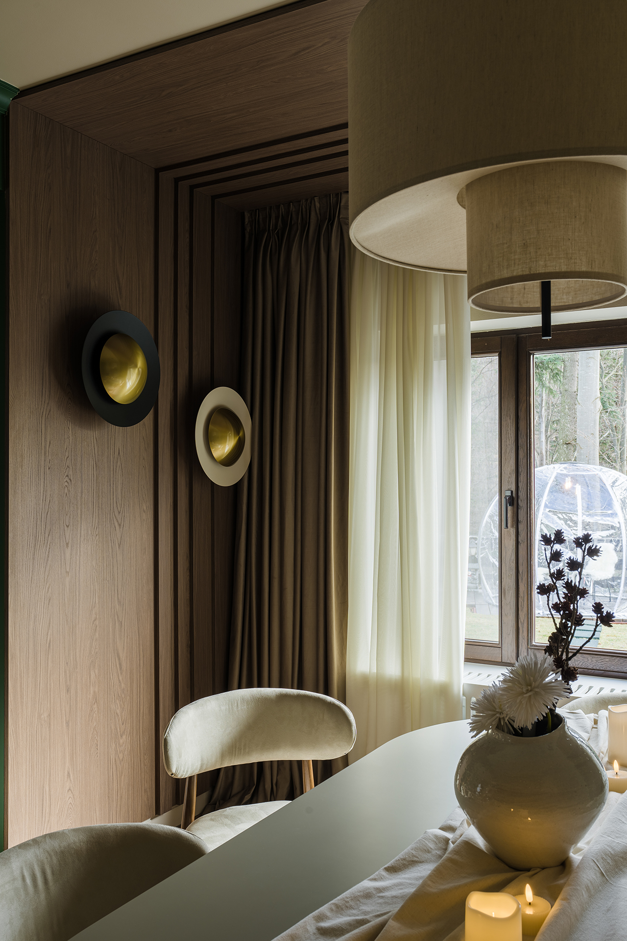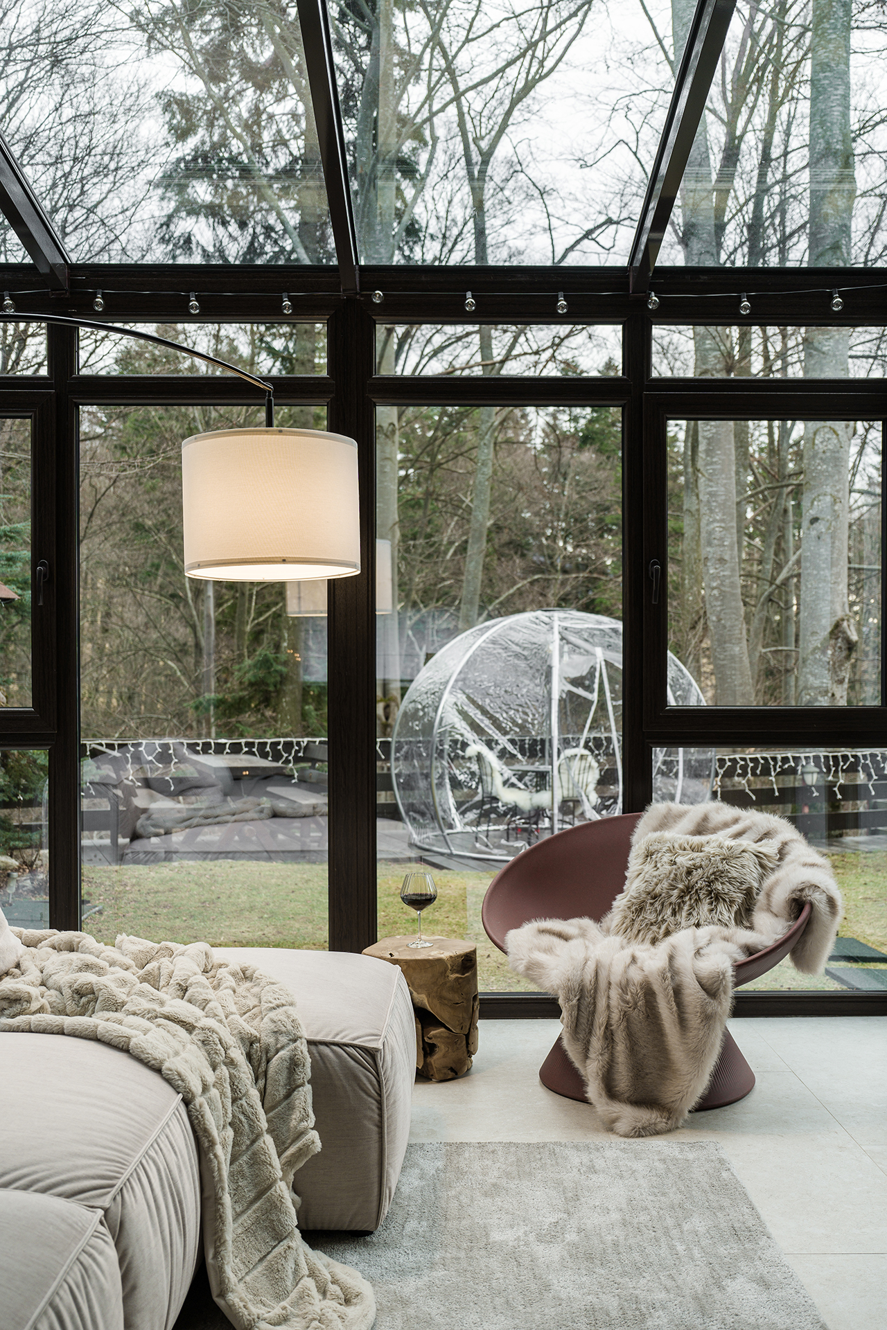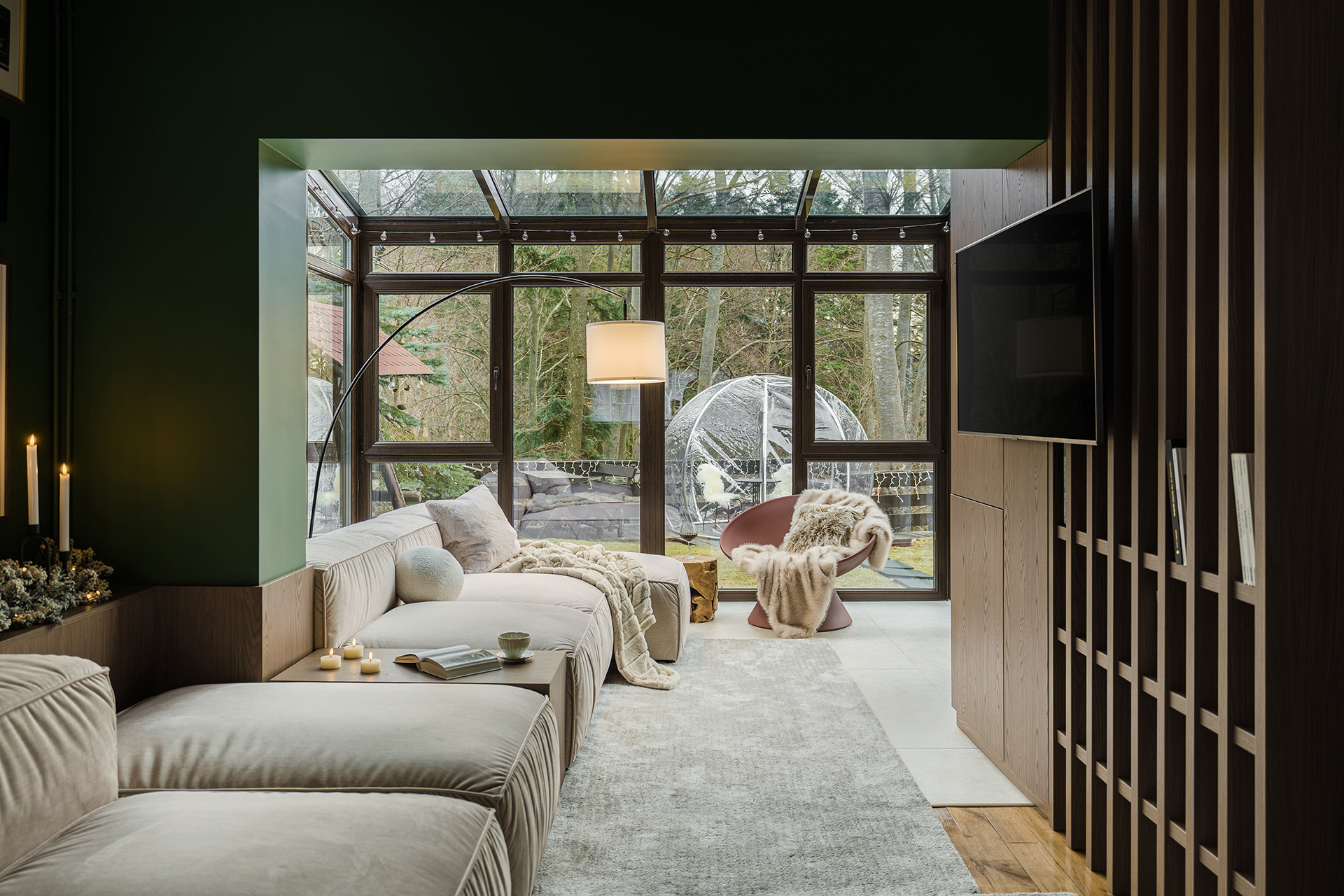 Peisajul spectaculos completează atmosfera cozy ce a a fost conturată prin detalii concrete: placări din lemn care încălzesc vizual spațiul, luminile calde și texturile naturale.
